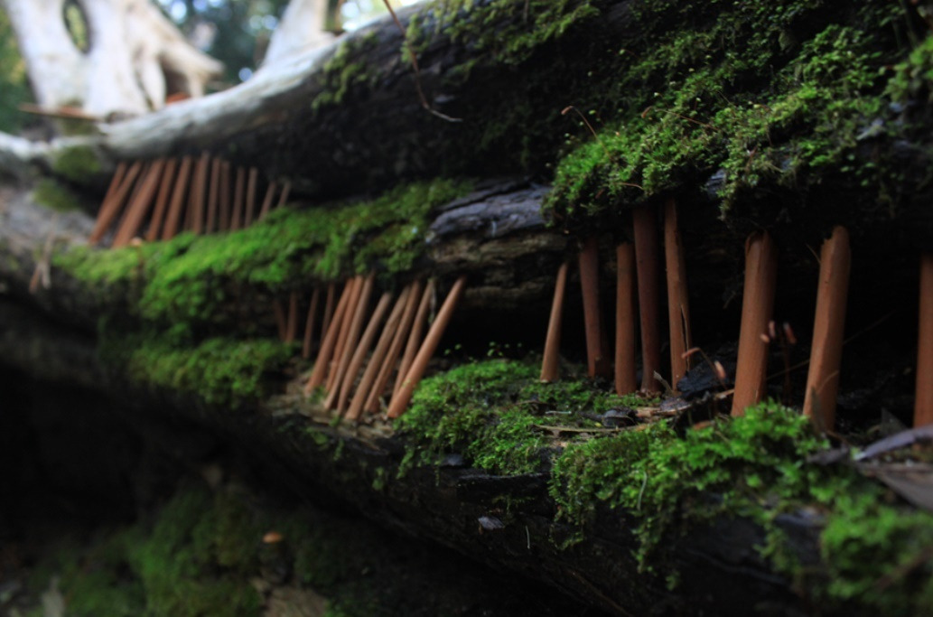 Pieces of tree bark found on the ground were placed in crevices on an old tree stump covered with moss - Tokai Plantation, Tokai, Cape Town, South Africa