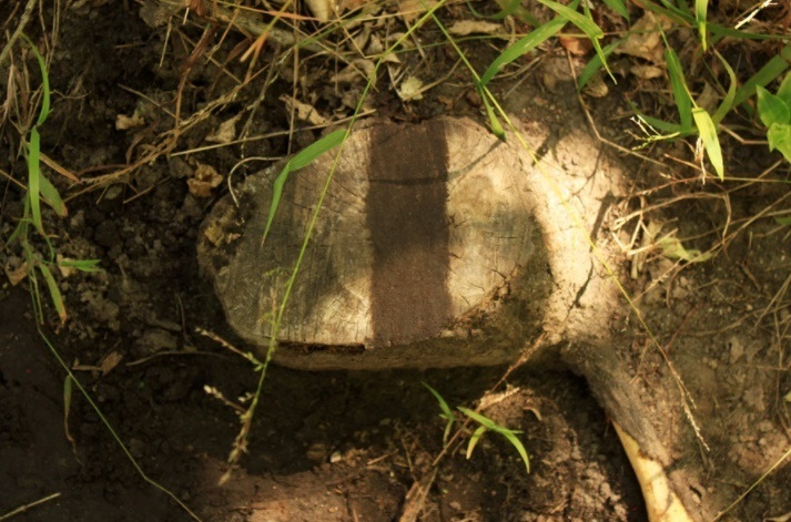 Fingerpainting a mud line or 'fake shadow' onto a cut tree trunk - a ghost image of a branch that were part of the tree.