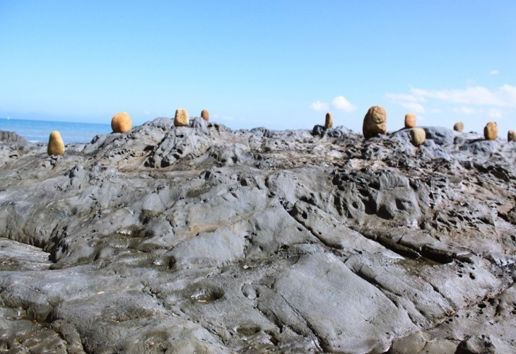 Red round rocks placed on dark rocks on the beach,