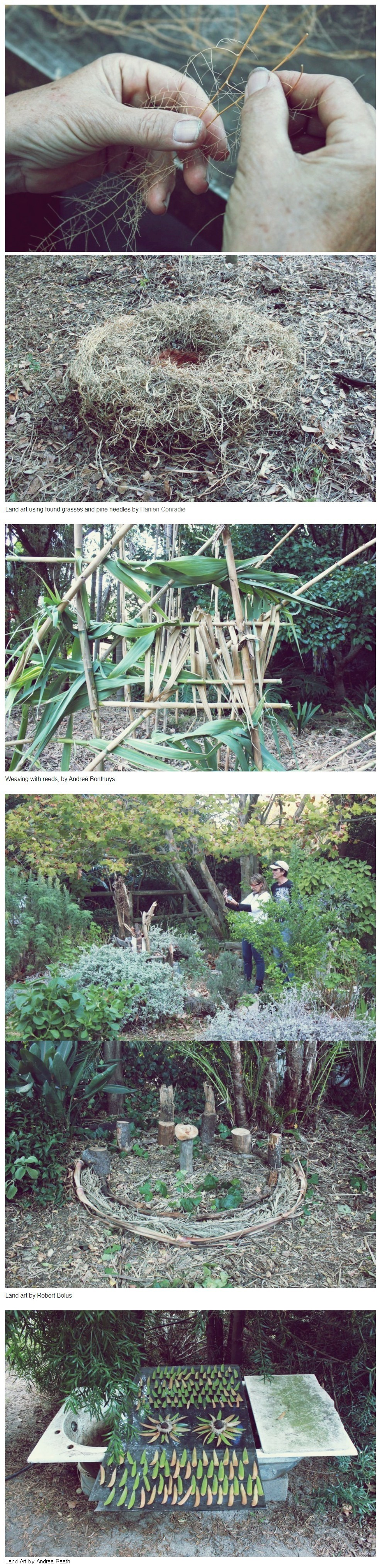 Once a month a group of artists in Cape Town gathers in different local sites to create temporary, site-specific installations. April's gathering was in Cheryl Traub Adler's beautiful garden in transition in Tokai. We had a lot of materials to work with and had a lot of wonderful connecting - with the land, the plants, the dogs and with each other.