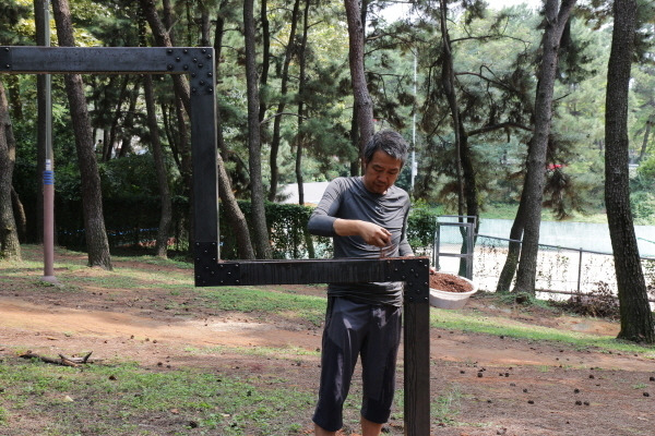 구조적으로 불완전한 작업물은 나무에 기대어 설치됨으로서 그 안정성이 유지된다.