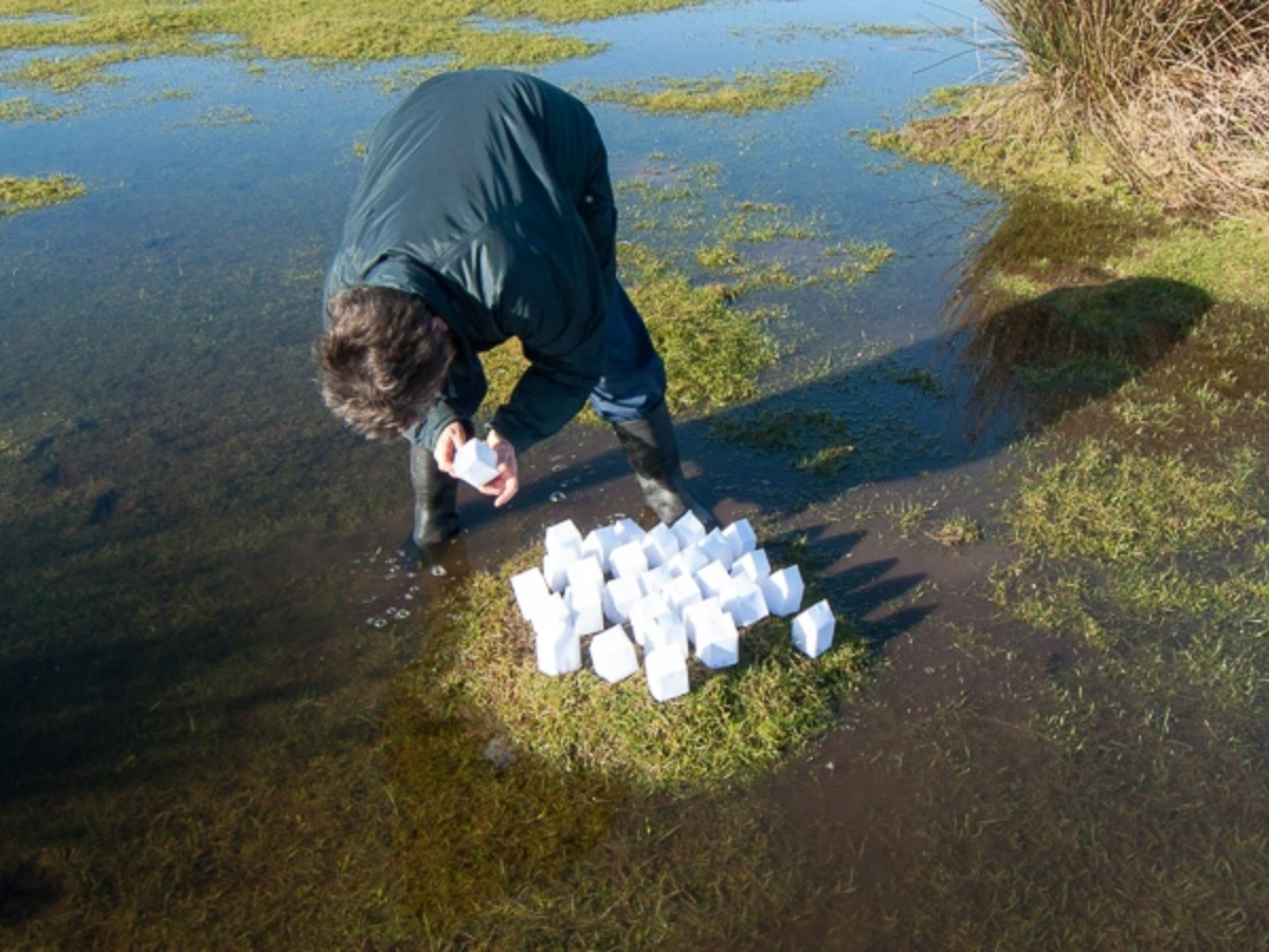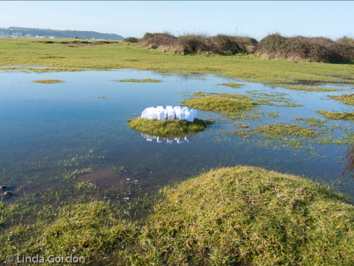 Here’s a couple of photos of this first test out on the waterlogged Burrows. In case you are wondering – after a bit of trial and error, I did eventually find a way to stop the houses from blowing away, and the bottom edges are carefully painted with clear nail varnish, to stop the landwater from soaking upwards. There is an interesting paradox here, in that I am using a lightweight water-absorbent material, as opposed to the hard impervious materials of real housing estates with their tarmacked and concreted infrastructure.