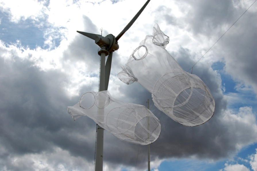 My wind objects, ROYAL PAIR, are adapted to the North Hessian Landscape. They are situated amongst windmills that now overpower the old hilly land. A pair of gossamer white gowns float out in the wind on a wide open summit plain that is towered over by wind turbines. This 'Royal Pair' dance in the wind. In ancient times the kings of the Saxons and the Franks met in this region to dominate the land. My objects refer to these events, therefore the sizes are slightly different and yet almost the same. The forms blow with wind showing their full dimension, glory and power.
