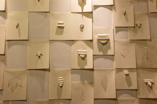 I collected all kinds of leaves in this village and traced (moved) their shapes using carbon paper, then cut them out and folded them into stair-like forms. Leaves and stair shapes symbolize opposing ideas of nature and civilization.