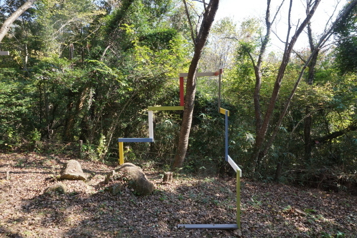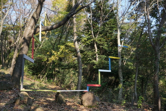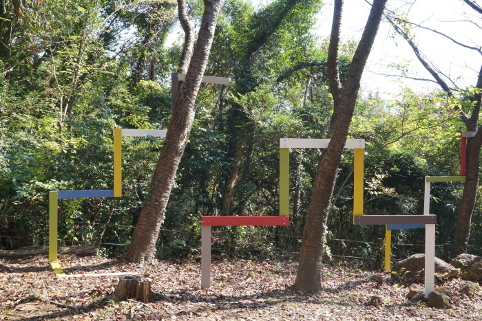 Trees are linked by a wooden structure of a stair shape, consisting of a vertical line and a horizontal which have different colors collected from fallen leaves and sky. This work shows the strong contrast between nature and wooden structure, however they are connected physically. In this work the stair shape guides peoples’ eyes to move up and down the space to question the relationship between trees, leaves, space and visitors.