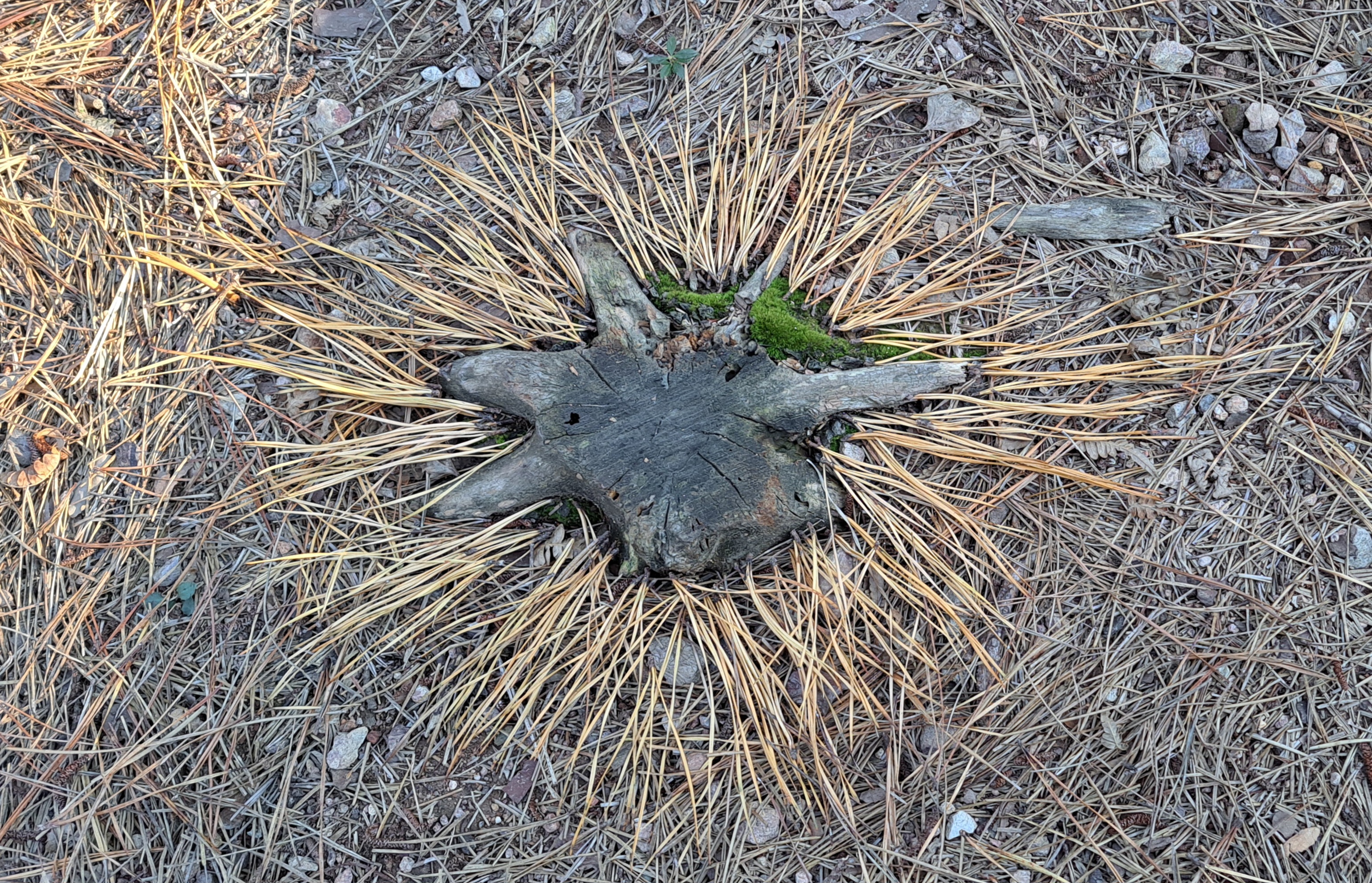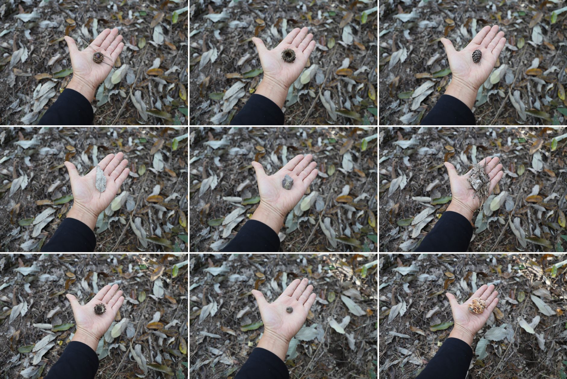 Lorna Green, Experiments with white and black lava stones, feathers, cones and sticks, Autumn 2024, Cheshire, UK
