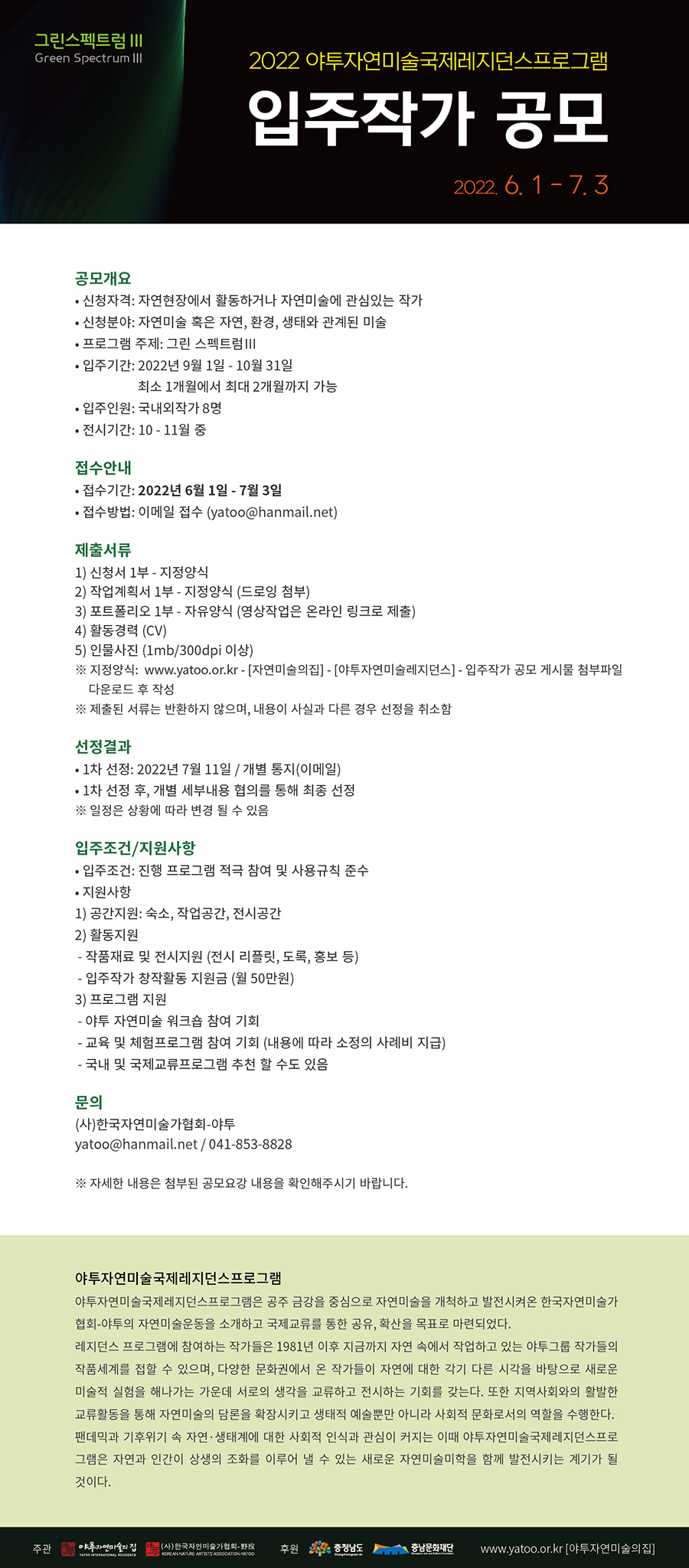 [공모] 2022 야투자연미술국제레지던스프로그램 입주작가 공모 2024. 6. 21. 17:16 2022야투자연미술국제레지던스프로그램공모요강및신청서.hwp 0.37MB 2022야투자연미술국제레지던스프로그램공모요강및신청서.pdf 0.19MB 공유하기 게시글 관리 YATOO-i 저작자표시 비영리 변경금지 (새창열림)